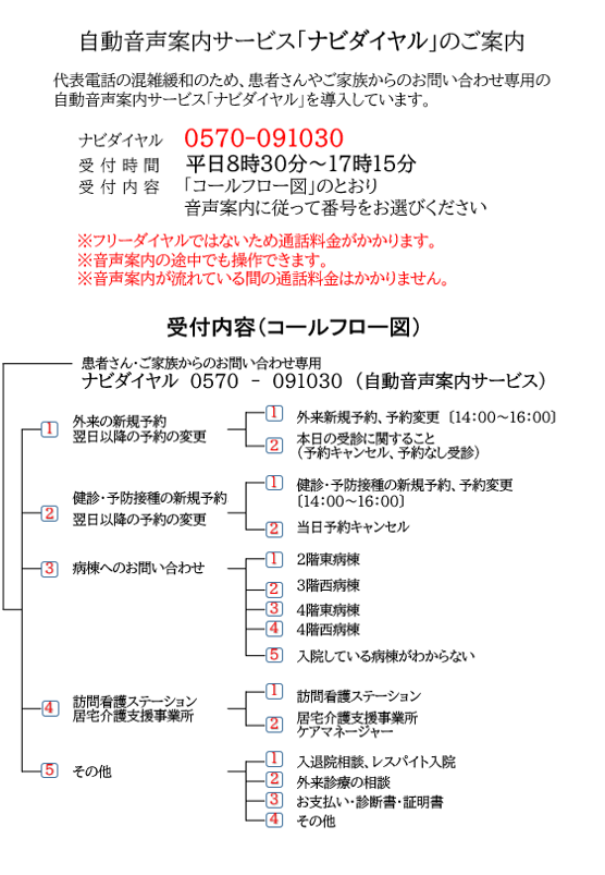 代表電話の混雑緩和のため、患者さんやご家族からのお問い合わせ専用の自動音声案内サービス「ナビダイヤル」を導入しています。